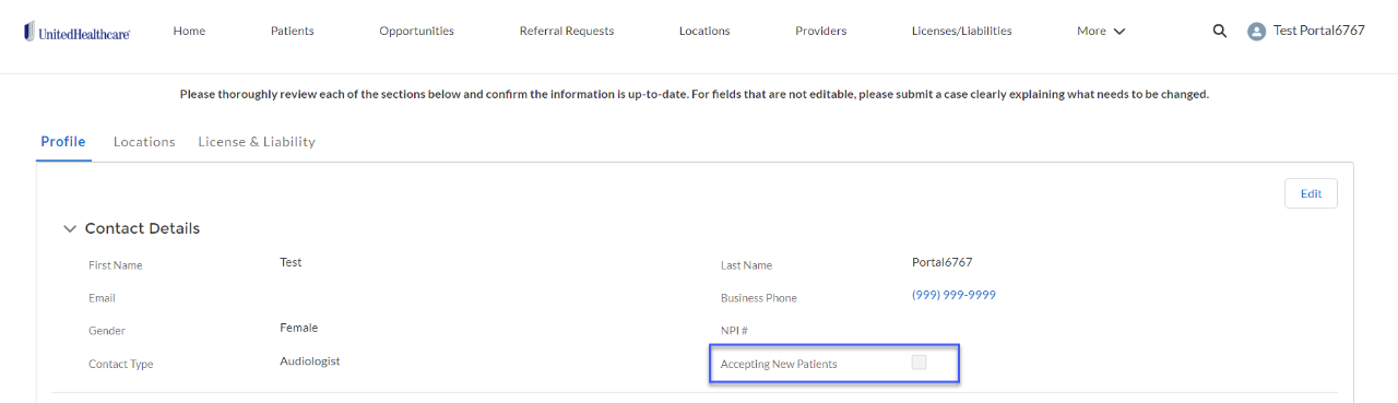 When ready to begin receiving opportunity referrals again, return to your profile and select the Accepting New Patients checkbox. Please be aware that this will no longer be referred to as “Reverse Referral Only” status. Instead, you will need to ensure your Accepting New Patients status is correct on your provider profile page in the portal.